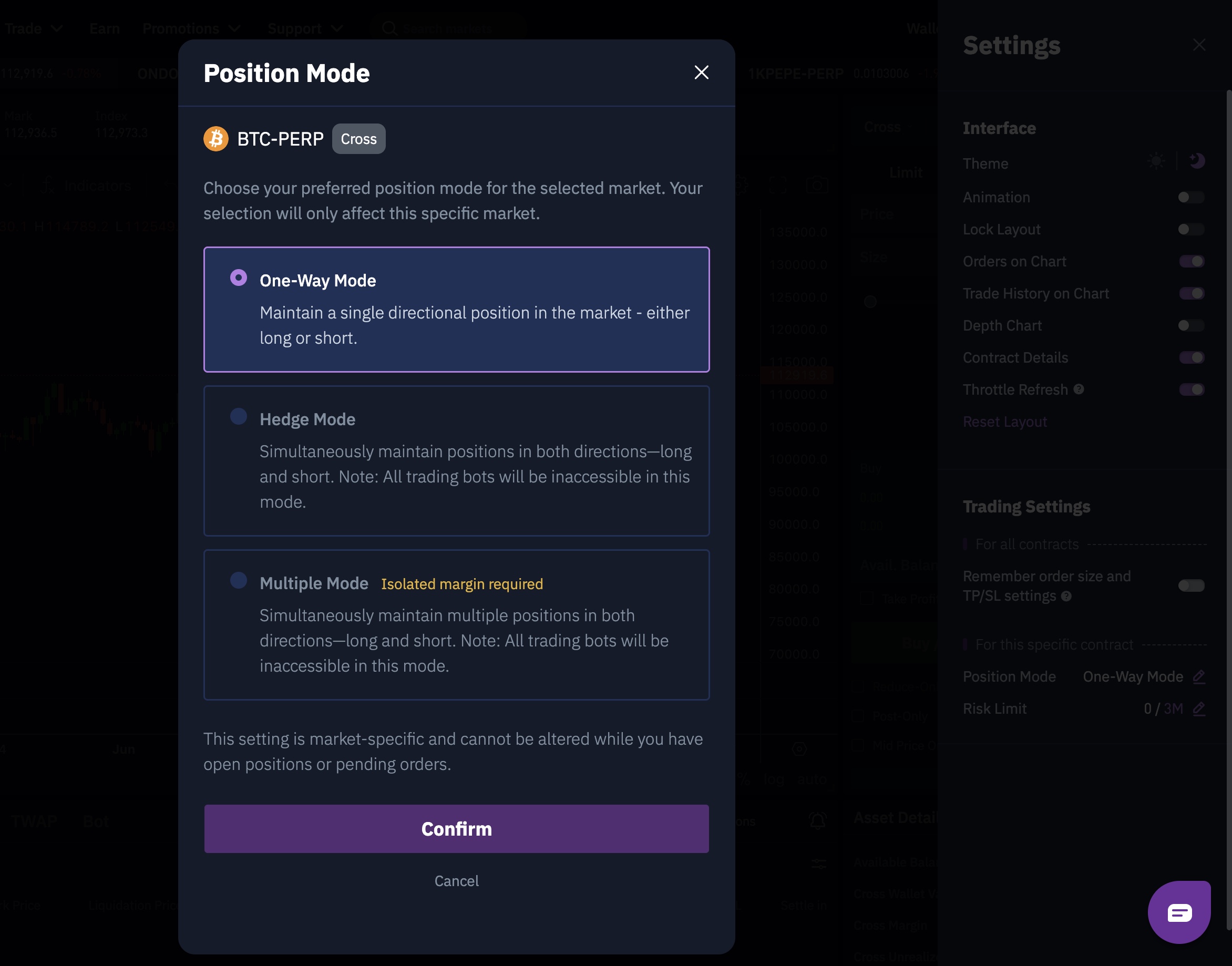 One-Way Mode refers to a specific position mode setting. When you set your position mode to One-Way Mode, you can only hold one direction, either long or short. This mode offers a straightforward way to manage your position, allowing you to change your position size and direction with ease.